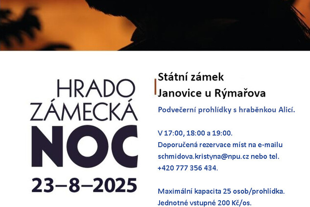 Zámek Janovice u Rýmařova se i v letošním roce připojuje k akci Hradozámecká noc. V sobotu 23. srpna 2025 proběhnou podvečerní prohlídky s hraběnkou Alicí. A to v 17:00, 18:00 a 19:00. Doporučená rezervace míst na e-mailu schmidova.kristyna@npu.cz nebo tel. +420 777 356 434. Maximální kapacita 25 osob/prohlídka. Jednotné vstupné 200 Kč/os.
